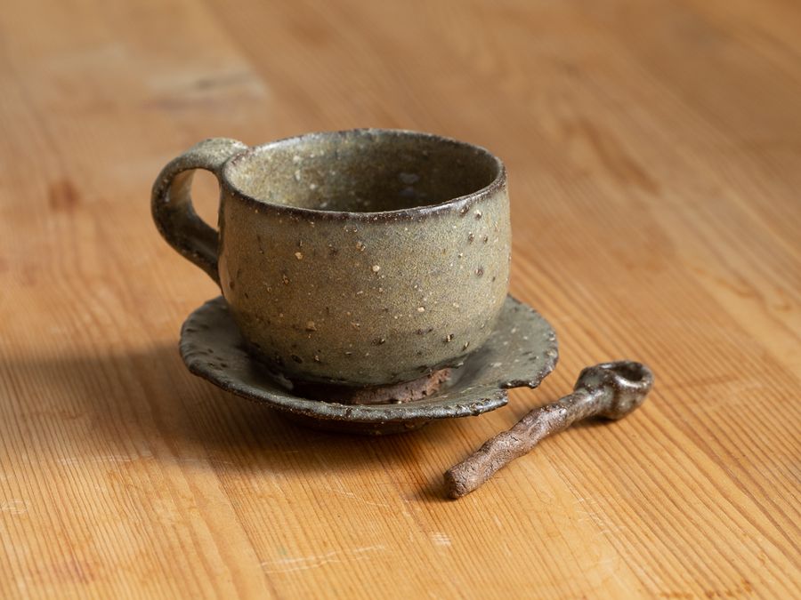 A cute little set made in heavily grogged clay that creates texture beneath the surface of the glaze. Comes with a saucer and a little spoon.