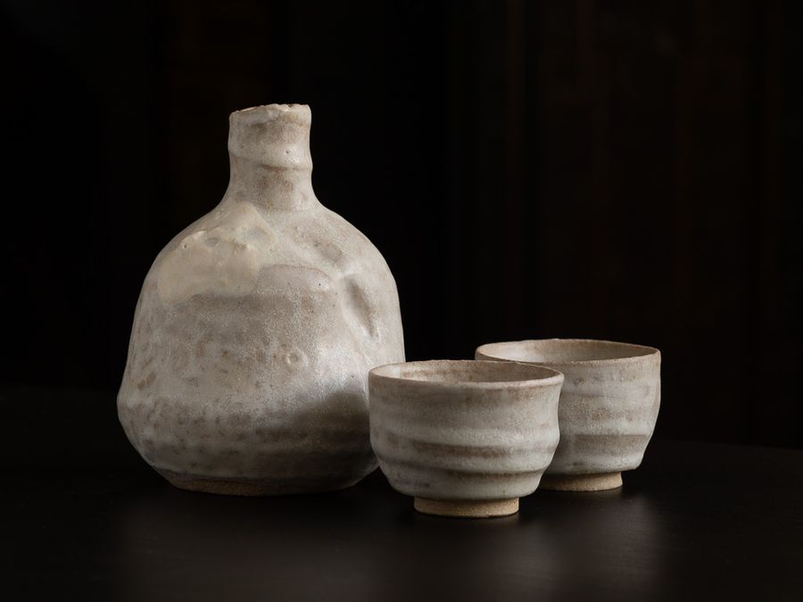 One bottle and two small cups traditionally used for drinking hot sake. Thrown with sanded stoneware and glazed. The height and width measurements below refer to the bottle.