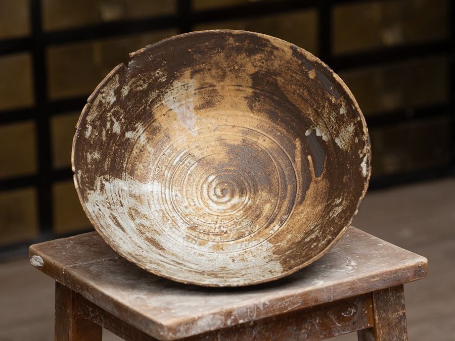 Thrown in heavily grogged black clay. Glazed with various slips and glazes.