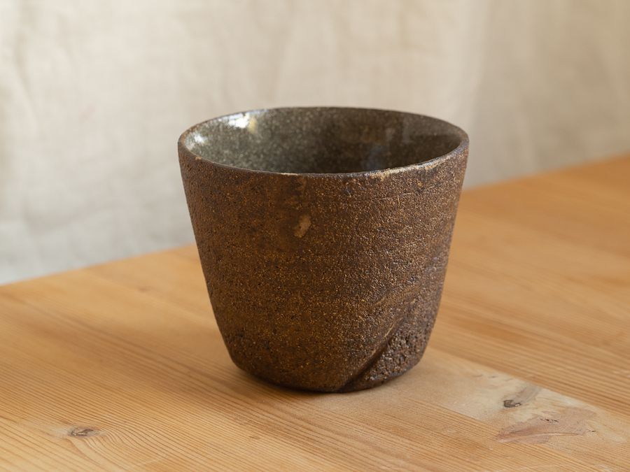 Hand thrown tumbler. The outside has various brushed glazes that bring out the natural quality and texture of the clay. The textured surface and indentation help it feel very nice in the hand..