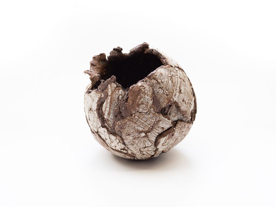Made with a process involving throwing and hand building. The clay is pushed and stretched to it’s limit to make features out of the cracks and fissures.